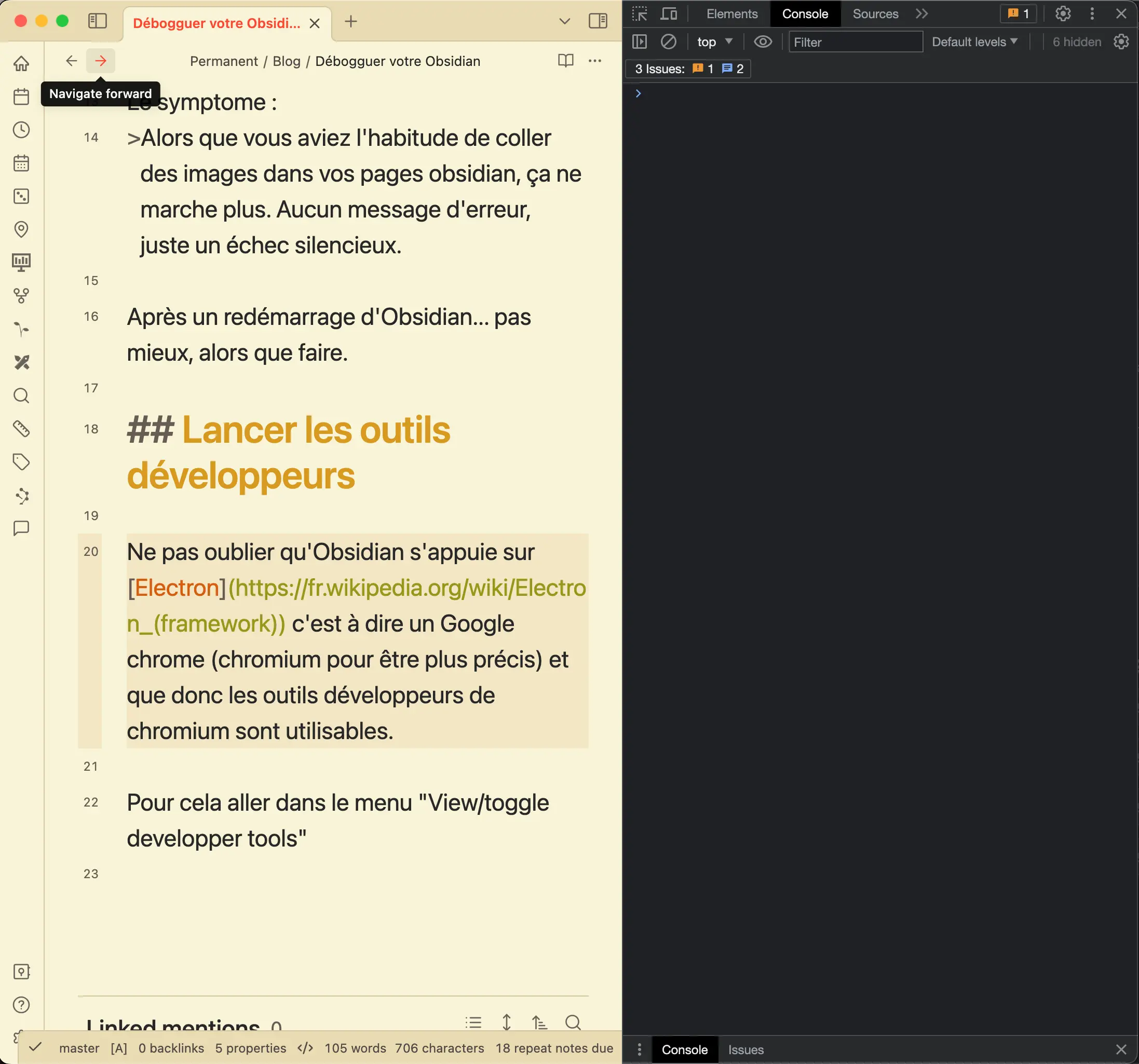 Voici à travers un exemple pratique comment ouvrir le capot d'Obsidian et investiguer si vous rencontrez un problème.