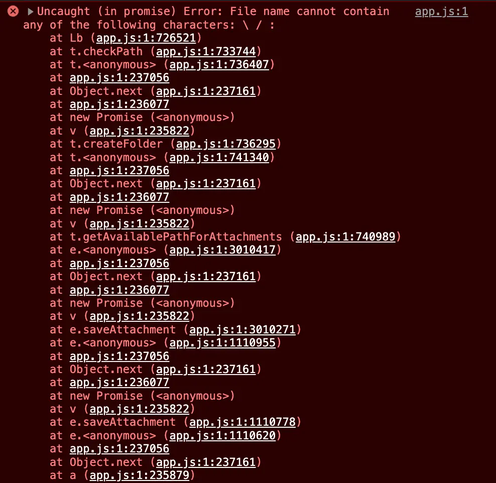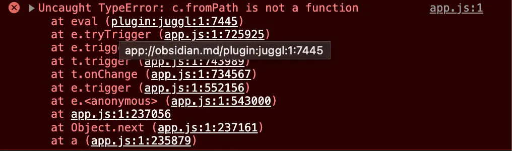 On peut voir dans l'erreur ci-dessus que l'erreur se produit dans la ligne " at Lb (app.js:1:726521)" soit dans "app.js", soit dans le coeur d'Obsidian.