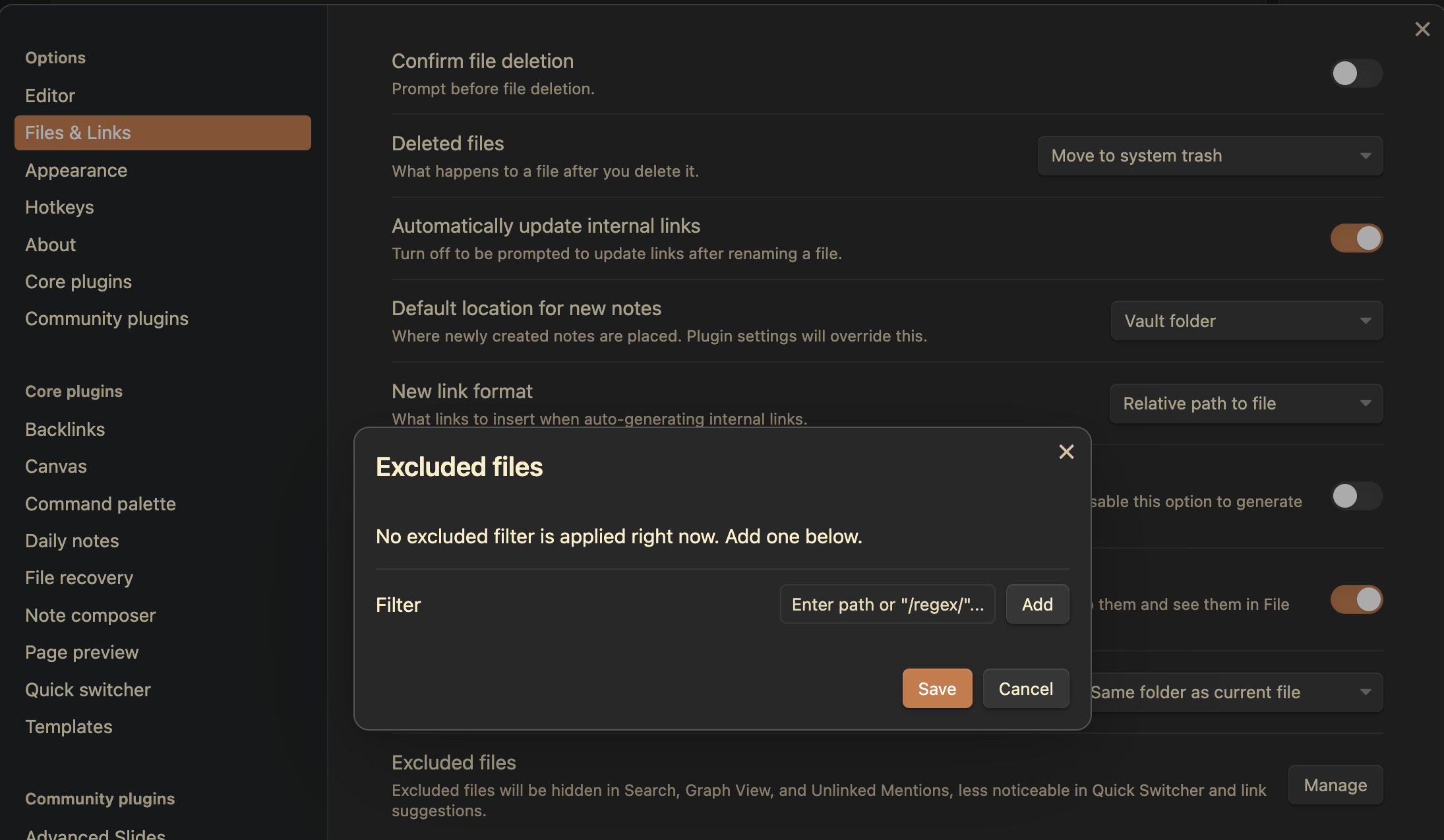 Aller dans les options / "files and links" / "manage"